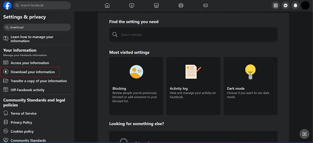 - Click on Download Your Information, which will take you to the Accounts Center, where you can click on the same function.